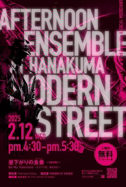 2024年10月26日(土)に実施した「昼下がりの食奏」のアンコールコンサート。西元町で人気の紅茶専門店「Tearoom CoCo.」さまのご厚意で会場を貸し切りにして開催しました。定員(12名)をはるかに超える応募があり、寒空の下で臨時のチェアを用意するほど盛況なイベントになりました。学生による吹奏楽アンサンブルだけでなく、飛び入りコーナーやオリジナルポップスのコーナーも設け、様々な音楽を楽しんでいただきました。