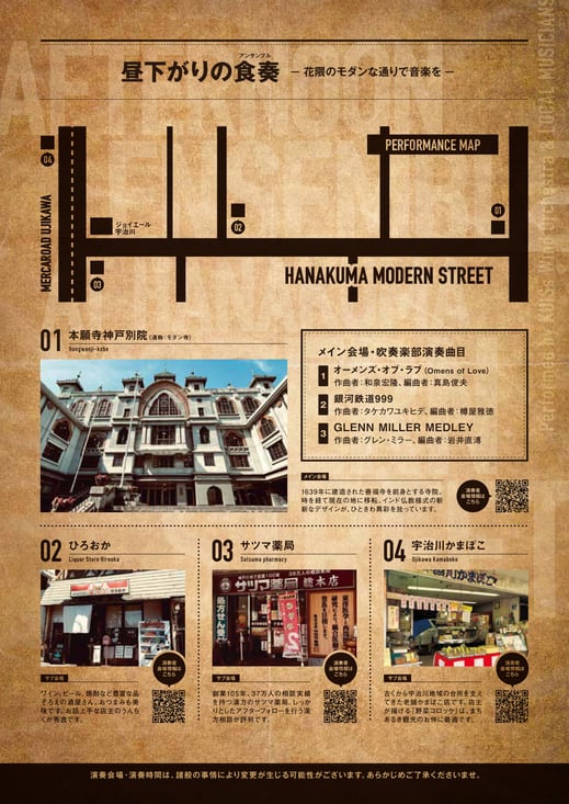 「昼下がりの食奏」にとって初めての大規模開催。本願寺神戸別院(モダン寺)をメイン会場に、3つのサブ会場にて演奏会とワークショップ(出張図書館、お絵描き)を開催しました。総動員数は250名を数え、大いに盛り上がりました。来場者特典として提供されたコロッケの2店舗は大行列になり、出演者(ごろー村長)による楽曲提供サービスもイベント当日に限定枠が埋まるほどでした。住民の皆さまや界隈のお店とともにこれからも末永くイベントを続けてゆければ嬉しく思います。